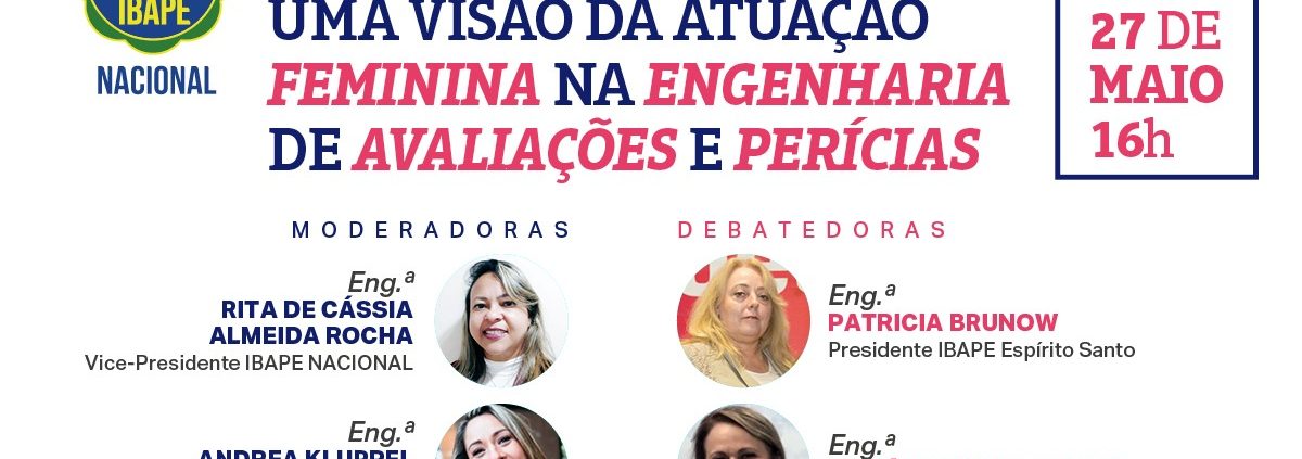 Inscrições através do site do IBAPE: https://ibape-nacional.com.br/site/viwebinar-uma-visao-da-atuacao-feminina-na-engenharia-de-avaliacoes-e-pericias/