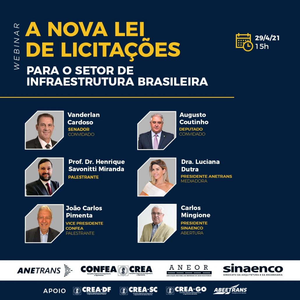 Anetrans, Aneor, Confea/Crea e Sinaenco, com apoio das mais importantes entidades do setor, convidam para a Webinar A Nova Lei de Licitações Para o Setor de Infraestrutura Brasileira – Reflexos e Benefícios.