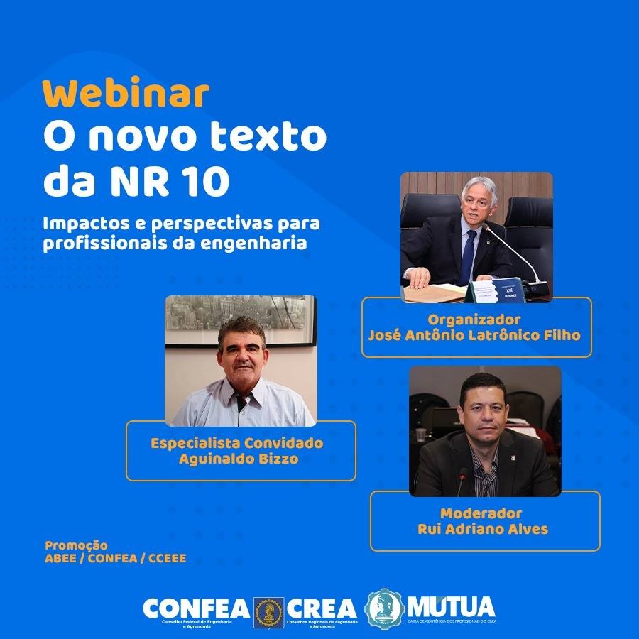 Nesta terça-feira, 16/06, a ABEE, a CCEEE e o Confea promovem webinário sobre a NR10 as principais alterações propostas no novo texto da Norma Regulamentadora – NR10 – Segurança em Instalações Elétricas e Serviços com Eletricidade para os profissionais legalmente habilitados. O engenheiro eletricista Aguinaldo Bizzo de Almeida, conselheiro do Crea-SP que participa da comissão de revisão da norma, vai conduzir o webinário.