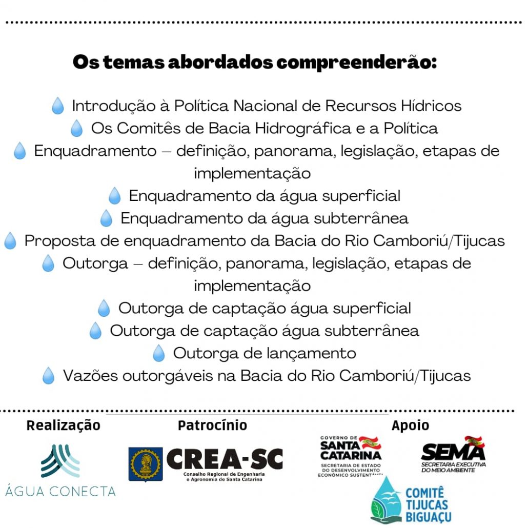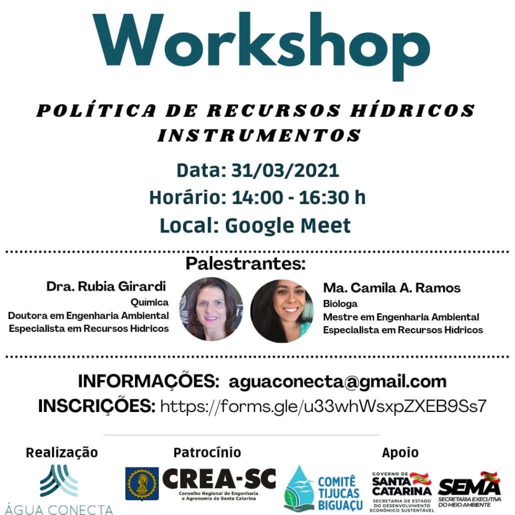 O Instituto Água Conecta, com apoio do CREA-SC por meio da Política de Patrocínio convida para mais um Workshop com o tema “Política de Recursos Hídricos Instrumentos”, no dia 31 de março, pelo Google Meet, das 14:00 – 16:30. Rubia Girardi, doutora em Engenharia Ambiental e especialista em Recursos Hídricos e Camila A. Ramos, mestre em Engenharia Ambiental e especialista em Recursos Hídricos serão as palestrantes. O treinamento é direcionado aos membros do Comitê Tijucas Biguaçu, entidades da sociedade civil, profissionais, estudantes e usuários interessados na gestão dos recursos hídricos.